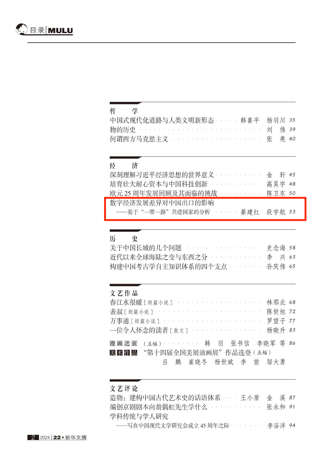 近日,《当代世界社会主义问题》2024年第2期刊发的《数字经济发展差异对中国出口的影响——基于“一带一路”共建国家的分析》被《新华文摘》2024年第22期转载。