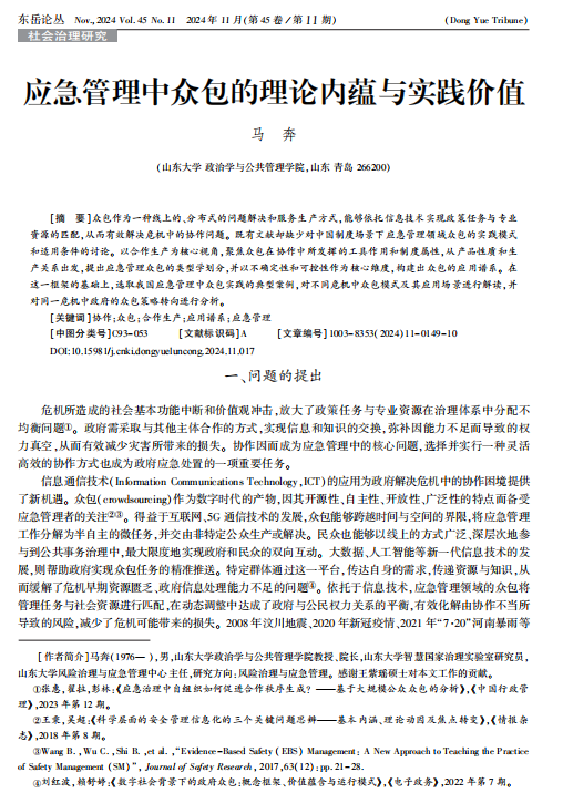 近日,69成人小说 智慧国家治理实验室执行主任马奔教授在《东岳论丛》期刊上发表了题为“应急管理中众包的理论内蕴与实践价值”的文章。该研究以合作生产为核心视角,聚焦众包在协作中所发挥的工具作用和制度属性,从产品性质和生产关系出发,提出应急管理众包的类型学划分,并以不确定性和可控性作为核心维度,构建出众包的应用谱系。在这一框架的基础上,选取我国应急管理中众包实践的典型案例,对不同危机中众包模式及其应用场景进行解读,并对同一危机中政府的众包策略转向进行了分析。