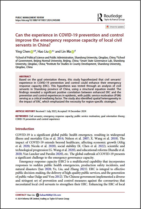 刘浩副教授作为通讯作者的文章《Can the experience in COVID-19 prevention and control improve the emergency response capacity of local civil servants in China?》在公共管理学科顶尖期刊Public Management Review在线发表。Public Management Review期刊在管理学类别中位于一区(Q1),影响因子在公共行政和公共政策领域SSCI期刊中位列第三,是公共管理学科五大权威期刊之一。该文章是由刘浩副教授(通讯作者)及我院硕士研究生陈颖(第一作者)、马琳副教授合作完成。该科研成果得到国家社会科学基金(23BGL318,主持人刘浩)资助。