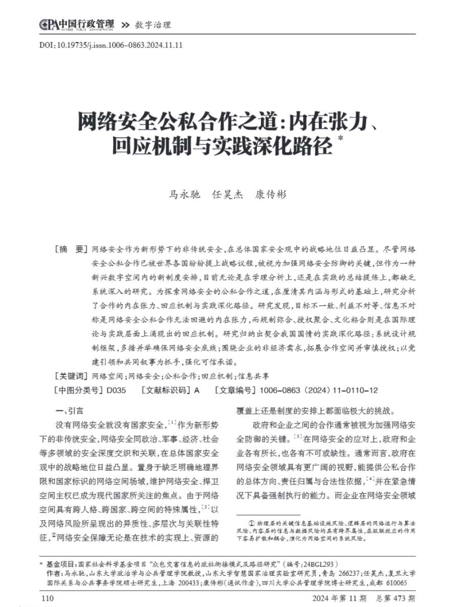 智慧国家治理实验室马永驰团队在上《中国行政管理》发表了题为《网络安全公私合作之道:内在张力、回应机制与实践深化路径》的论文。
