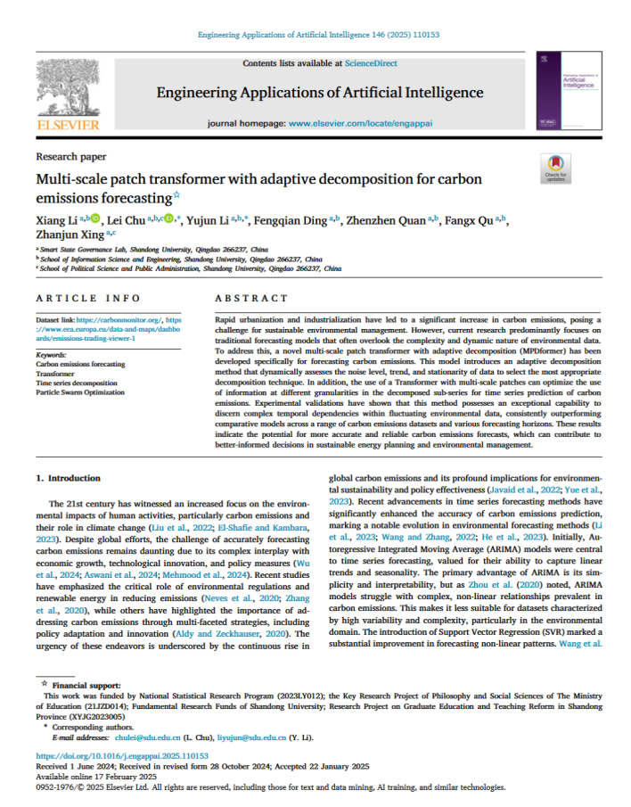 智慧国家治理实验室褚雷团队在SCI一区期刊《Engineering Applications of Artificial Intelligence》上发表了题为“Multi-scale patch transformer with adaptive decomposition for carbon emissions forecasting”的论文。文章为解决已有碳排放预测模型对生态环境质量数据的复杂性和动态性把握的不足问题,提出了一种新型多尺度块(Patch)变换器与自适应分解(简称MPDformer)的深度学习模型用于碳排放的预测。基于全球气候数据的实证结果显示,该深度学习模型表现出了在波动环境数据中识别复杂时间依赖关系的能力,优于已有传统预测模型,研究在可持续能源预测和环境质量评价领域取得了实质性的进展。69成人小说