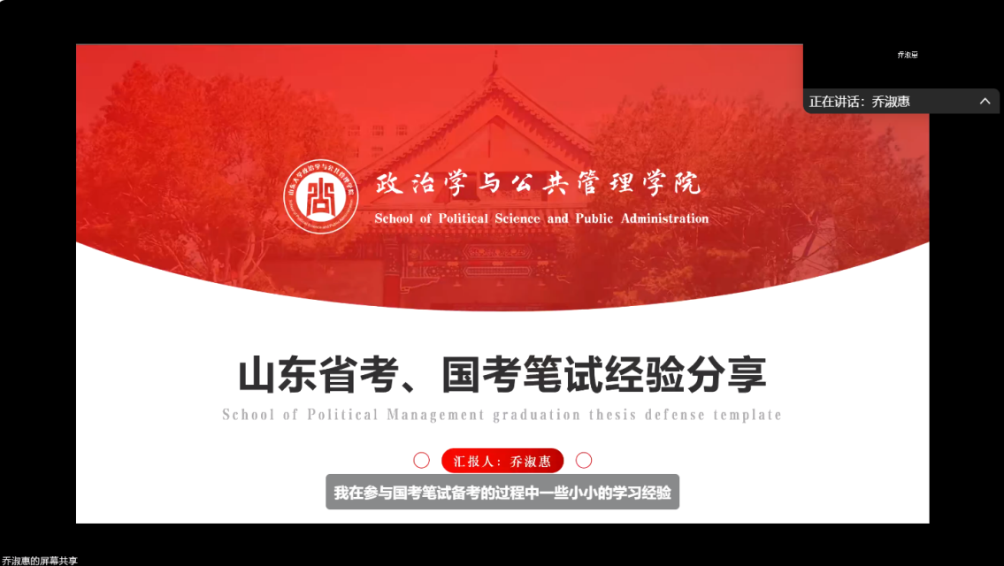 7月6日晚,由25届硕士毕业生乔淑惠同学分享山东省考、国考的笔面试经验,分享人凭借其高分上岸山东省考和国考的实战经历,传授笔试高效复习策略、面试核心技巧及考场应对心得,为同学们提供了宝贵的“第一手”备考指南。