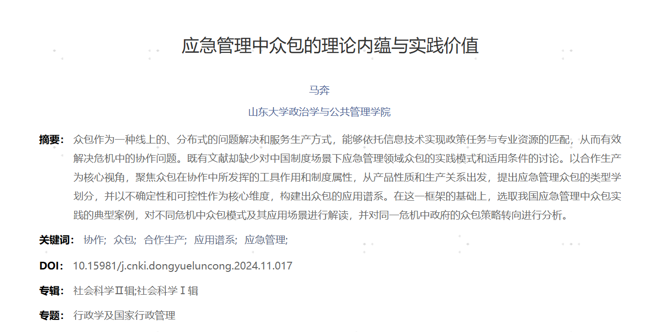 风险治理和应急管理研究中心主任马奔教授发表在《东岳论丛》的论文《应急管理中众包的理论内蕴与实践价值》被中国人民大学书报资料中心复印报刊资料《公共行政》2025年第2期全文转载。