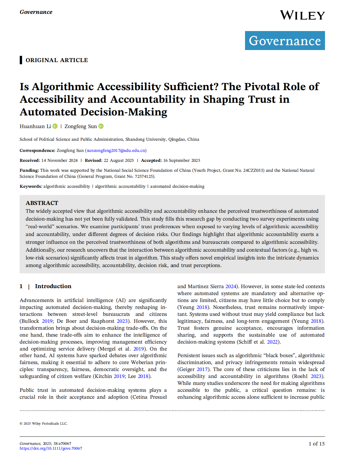 李欢欢助理研究员(第一作者)与孙宗锋教授(通讯作者),共同在AJG(ABS)四星级期刊、公共管理国际期刊Governance在线发表学术论文“Is Algorithmic Accessibility Sufficient? The Pivotal Role of Accessibility and Accountability in Shaping Trust in Automated Decision-Making”。
