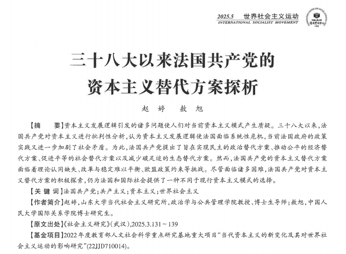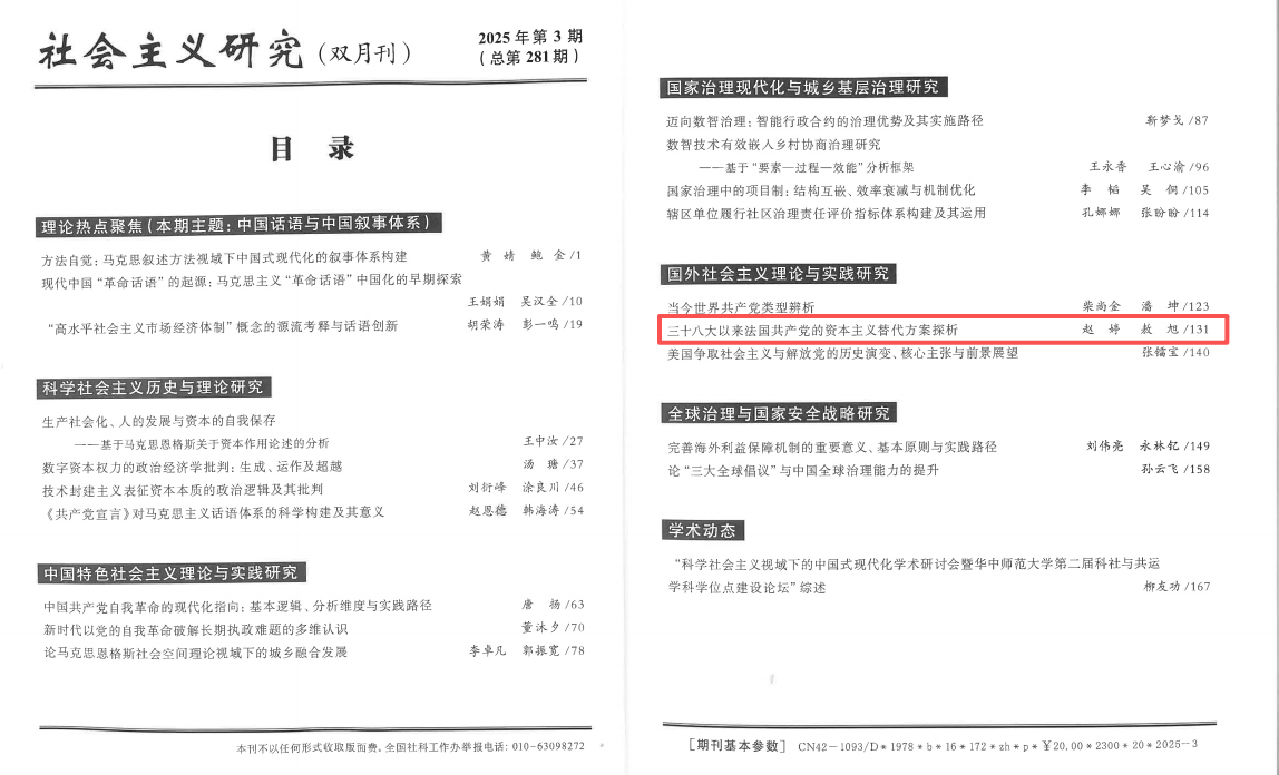 2023届中共党史专业硕士毕业生)合作发表在《社会主义研究》2025年第3期的论文《三十八大以来法国共产党的资本主义替代方案探析》被中国人民大学书报资料中心复印报刊资料《世界社会主义运动》2025年第5期全文转载。