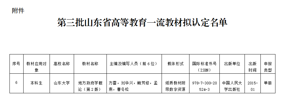 方雷教授主编《地方政府学概论(第2版)》教材成功入选。这是继2020年方雷教授主编《当代中国政府与政治》与《政治科学研究方法概论》、王佃利教授主编《现代市政学(第四版)》、滕玉成教授主编《公共部门人力资源管理》、高永贵副教授主编《公文写作与处理》等教材获选山东省高等教育一流教材后,69成人小说